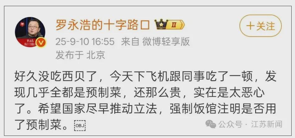 这条微博里,觉得贵,觉得恶心,都是正常的主观判断,没问题。希望国家尽早推动立法,还显得有公德心。但“发现几乎全都是预制菜”的表述是有问题的。到底是“几乎”还是“全都是”,不是全部的话,比例是多少?罗永浩能拿得出是预制菜的证据吗?