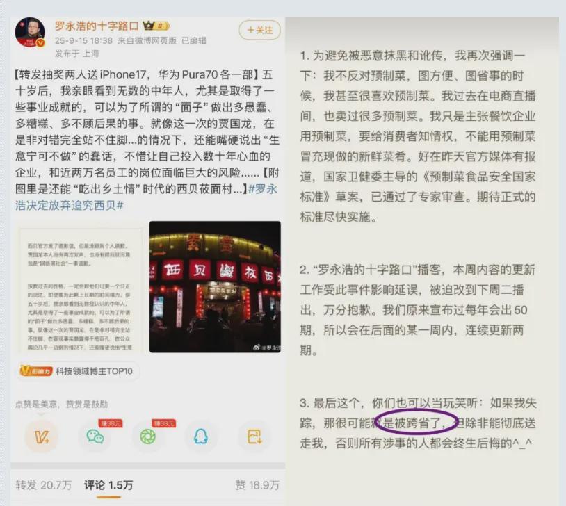 一是罗永浩2025年9月10日引发争端的那条微博。微博的全文如下:好久没吃西贝了,今天下飞机跟同事吃了一顿,发现几乎全都是预制菜,还那么贵,实在是太恶心了。希望国家尽早推动立法,强制饭馆注明是否用了预制菜。
